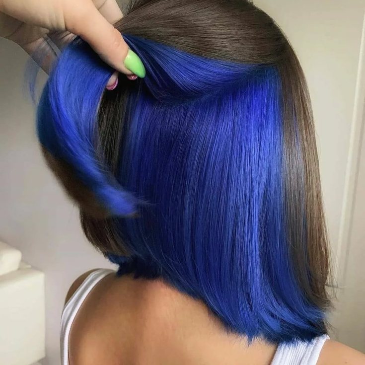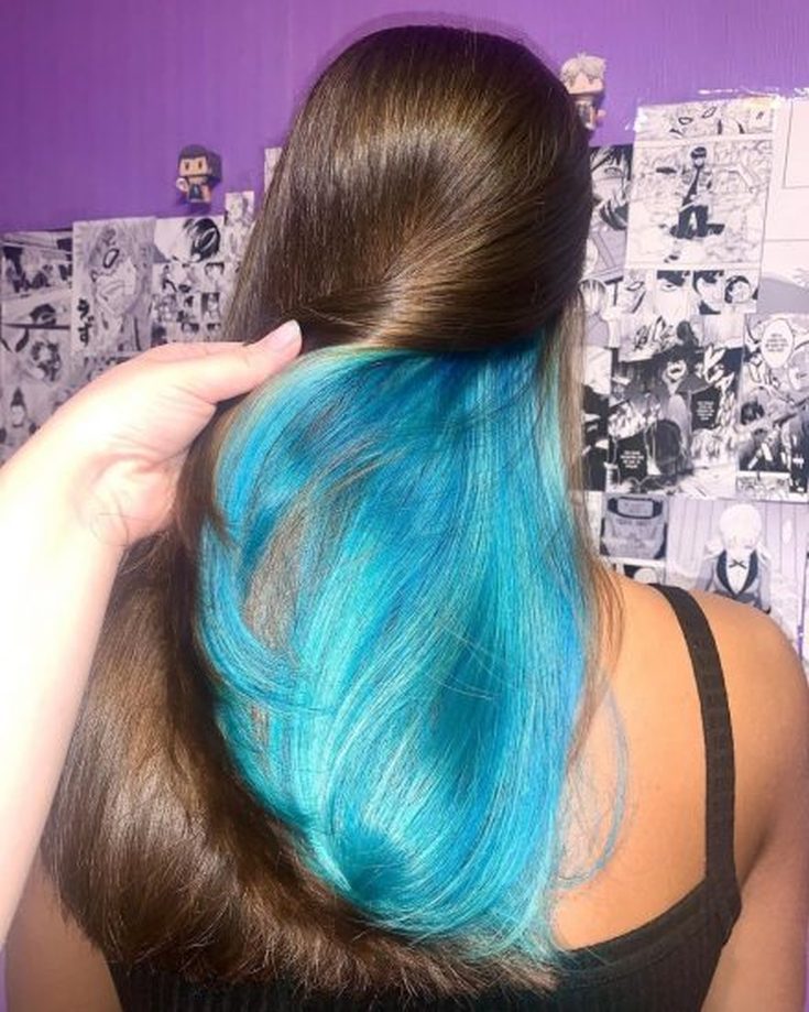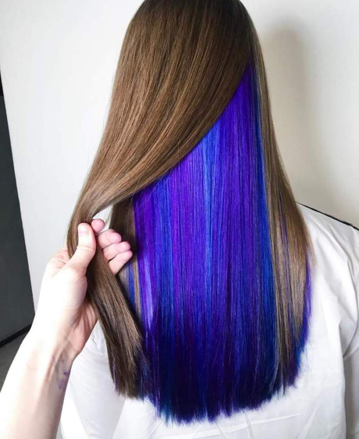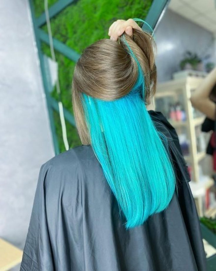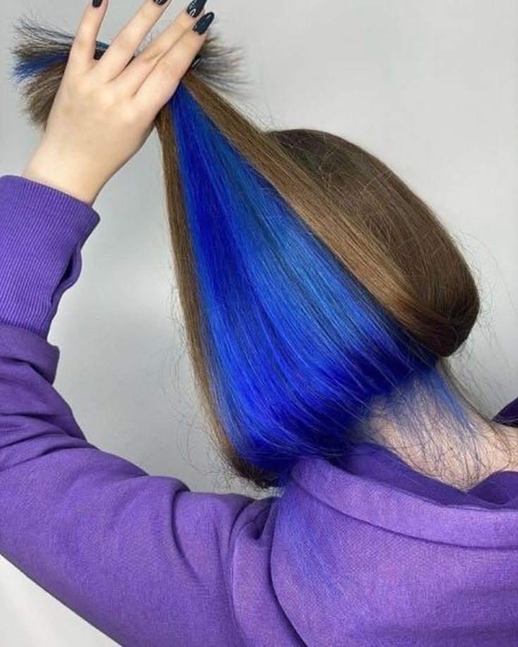 Um tom azul suave é outro favorito entre os fãs de tingimento secreto. O tom pastel fica ótimo no meio do cabelo loiro. O néon azul intenso se tornará uma solução ousada e yarim para mulheres de cabelos castanhos e morenas.
