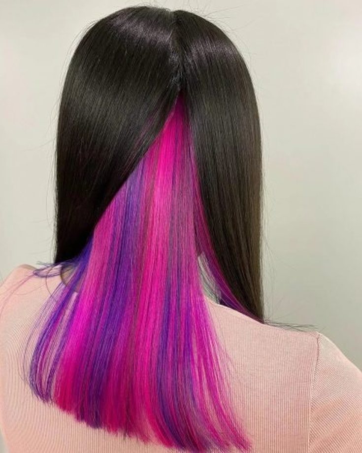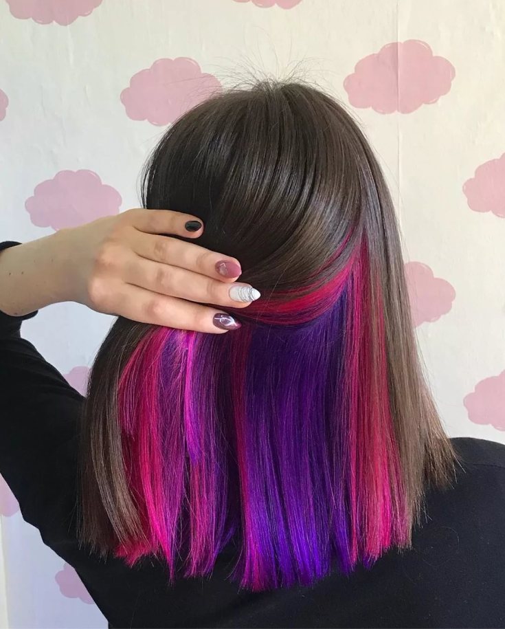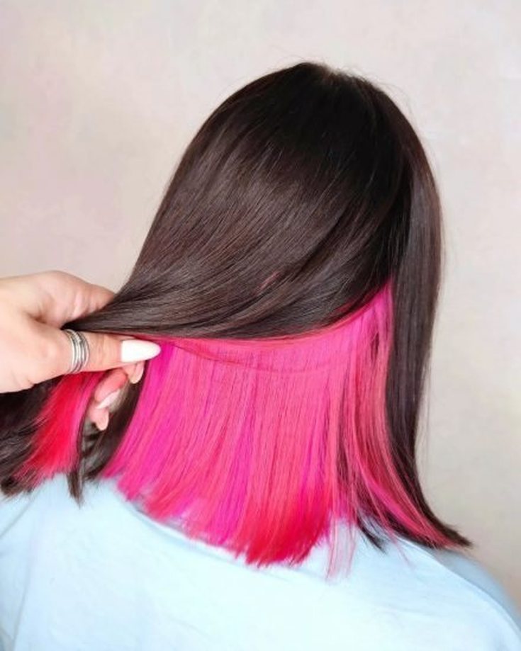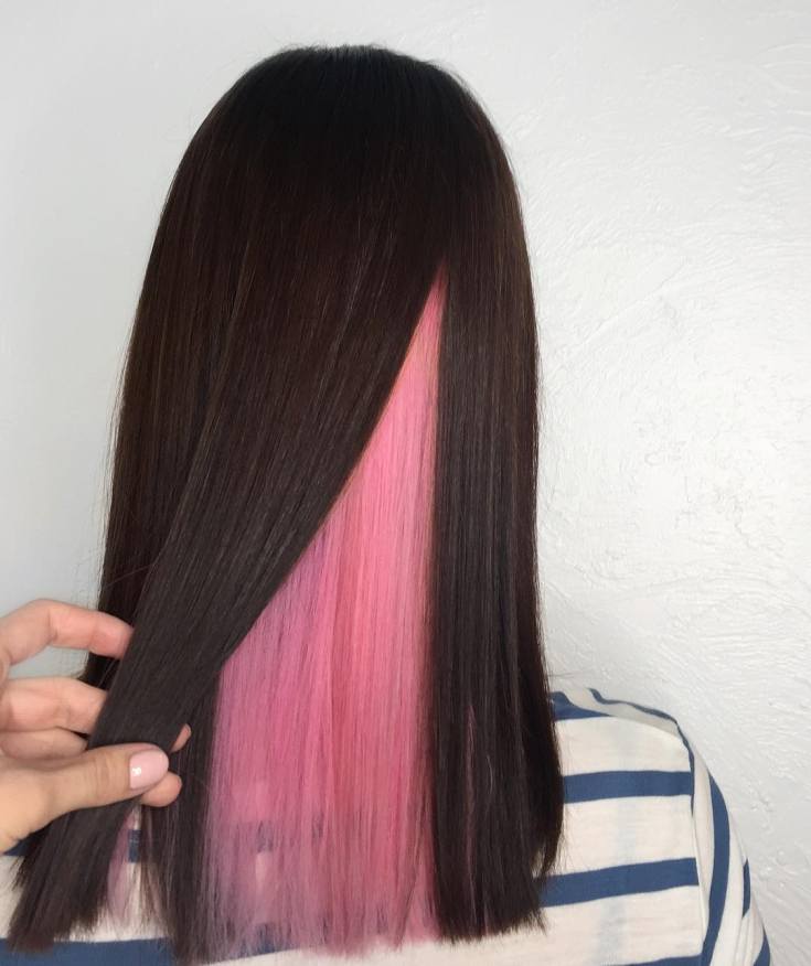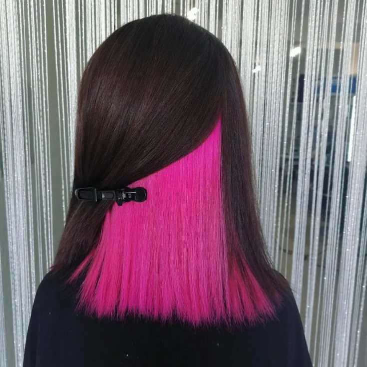 Uma das opções mais populares para colorir o cabelo oculto. O tom rosa está na moda nas últimas temporadas, não só no tingimento de fios, mas em manicure e roupas.