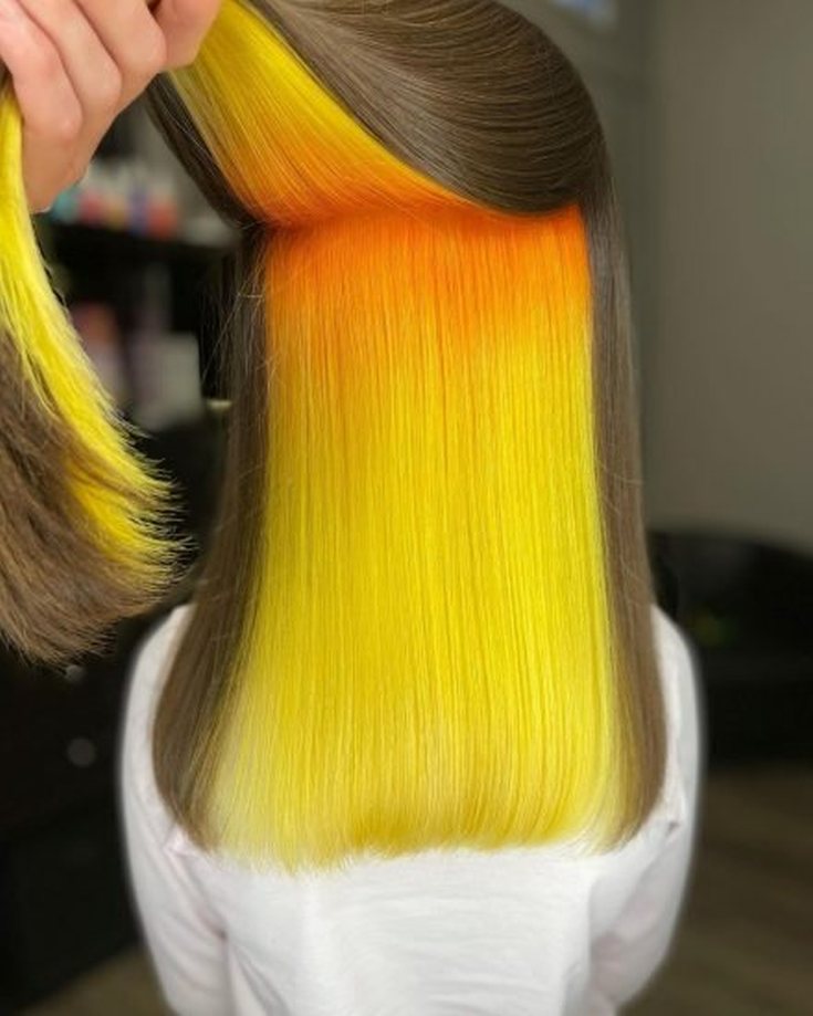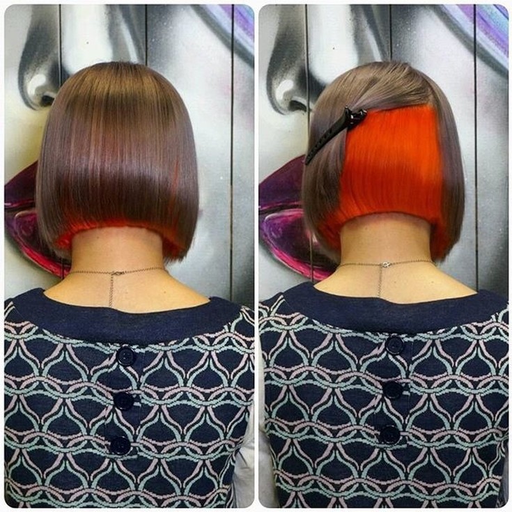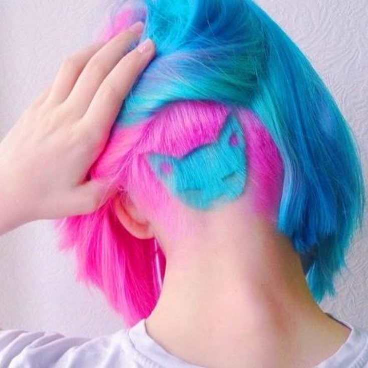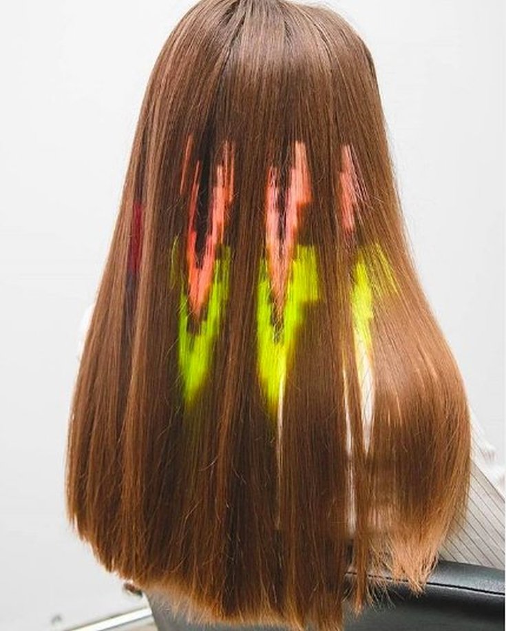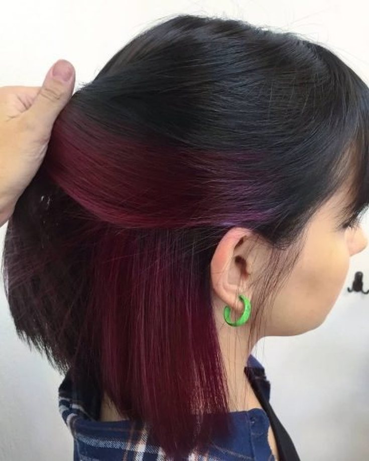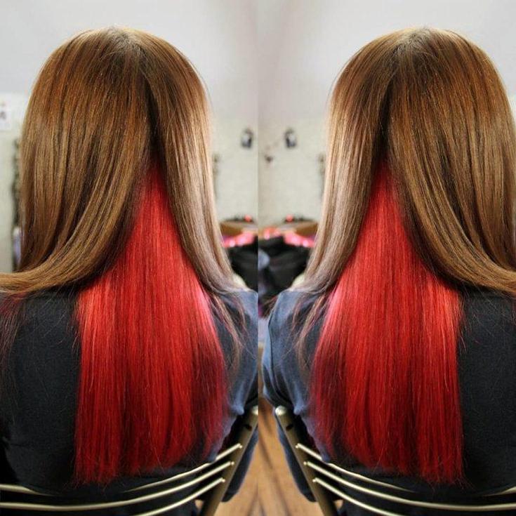 Uma das variações mais ousadas de coloração oculta. Uma certa área na parte de trás da cabeça é cortada mais curta, então um padrão é raspado com uma máquina, que é pintado na cor desejada. O padrão raspado fica oculto sob o peso total do cabelo. Mas assim que os cachos forem recolhidos em um penteado alto, a coloração espetacular estará à vista.