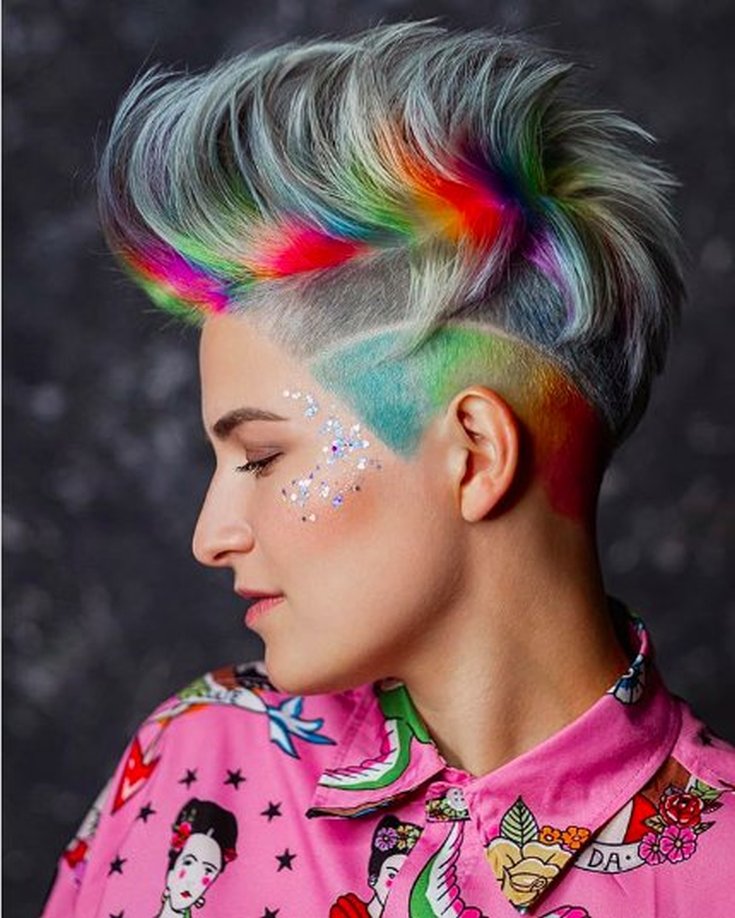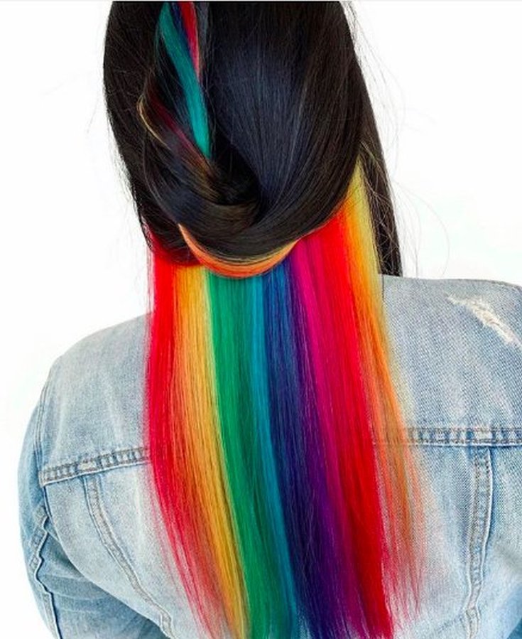 Na parte de trás da cabeça, a maior parte do cabelo é dividida em fios. Eles são pintados em uma variedade de cores. Você pode escolher 2 a 3 cores brilhantes para pintar ou usar muito mais cores, por exemplo, as cores do arco-íris.