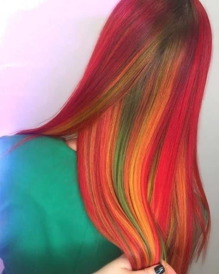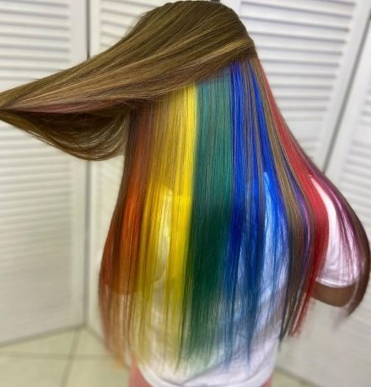 A popularidade do uso de uma ampla paleta de cores na coloração latente se deve ao fato de que o efeito surpresa é ampliado muitas vezes. A propósito, o arco-íris é uma opção de cor oculta muito popular que levanta o clima com seu brilho e fica bem tanto em uma cor de fundo atraente quanto em uma natural.