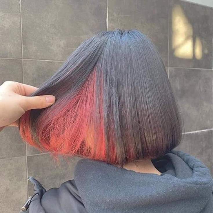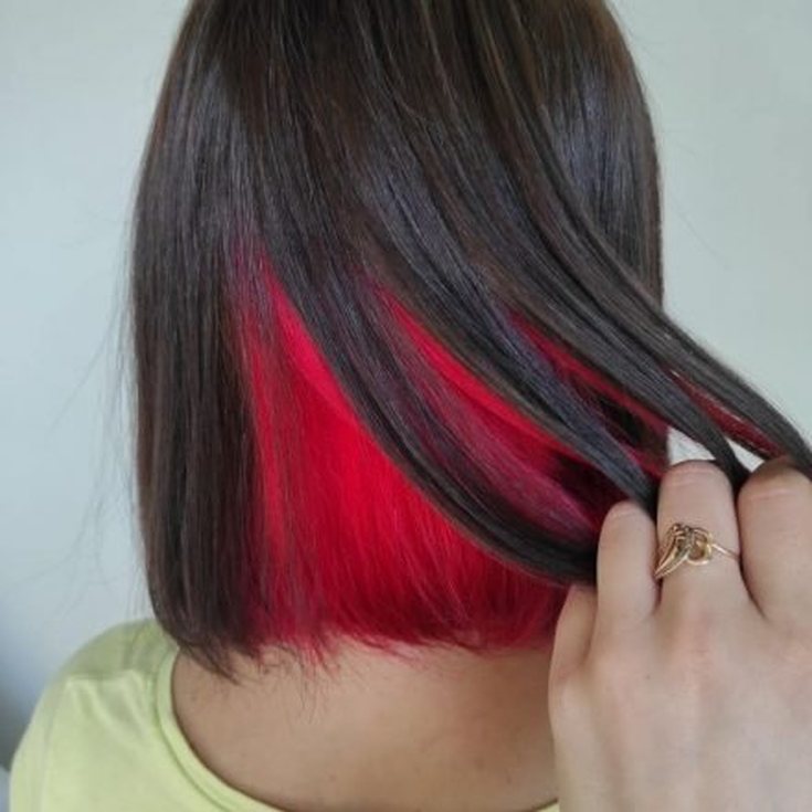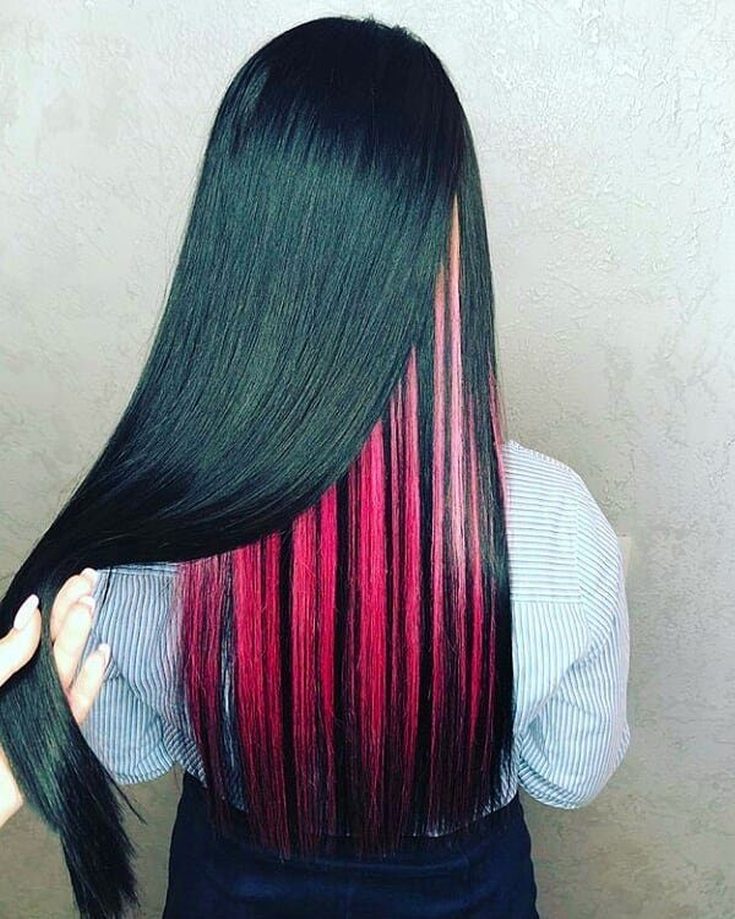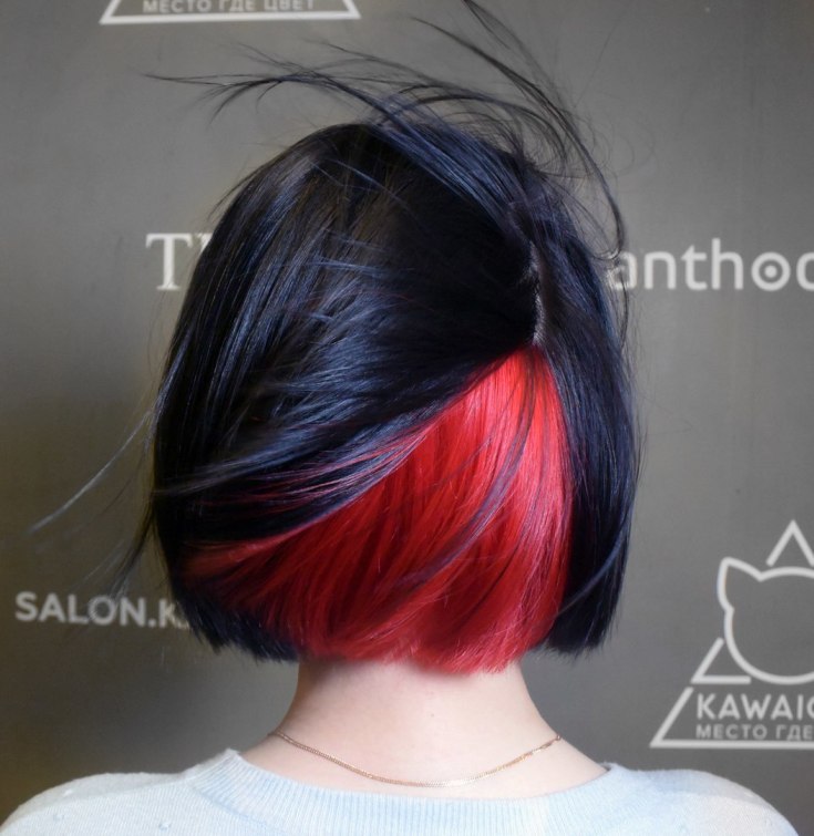 A tintura latente em cabelos escuros terá uma aparência original usando o vermelho e todos os seus tons. Para pretos profundos, tons de azul e roxo são adequados.