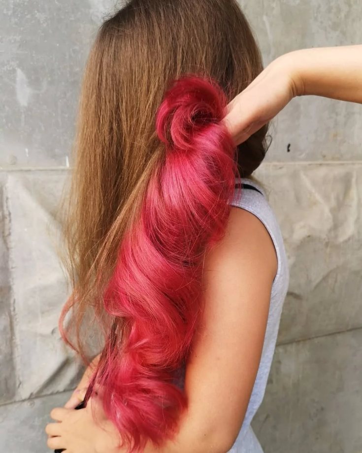 Nesta versão, o contraste é mais perceptível. Todos os fios inferiores foram tingidos em um tom rosa rico, uma reminiscência da cor da goma. Mas você pode escolher qualquer um. Isso já é uma questão de gosto. Com essa coloração, os fios brilhantes só serão notados se você prender o cabelo: por exemplo, em um rabo de cavalo ou em um coque.