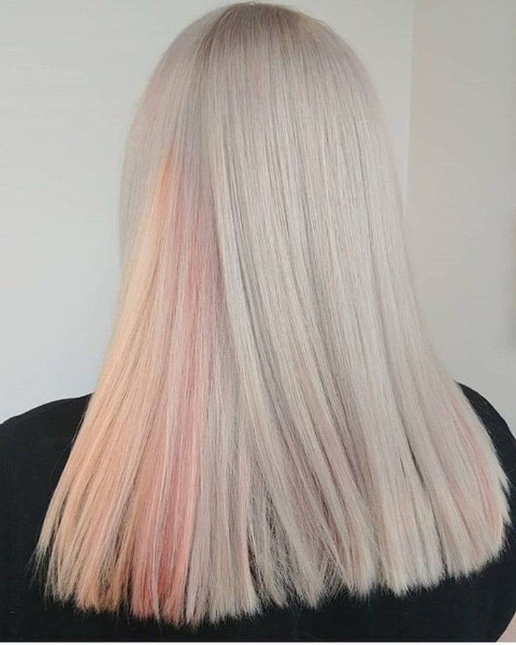 Essa coloração não ousa chamar a língua de desafiadora, mas é por isso que muitas pessoas podem gostar.A combinação de fios rosa e pêssego com diferentes intensidades de cor parecem transbordamentos perolados. Especialmente esta coloração é adequada para meninas com um louro acinzentado, mas você também pode experimentá-la com qualquer outra.
