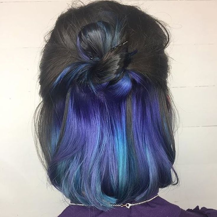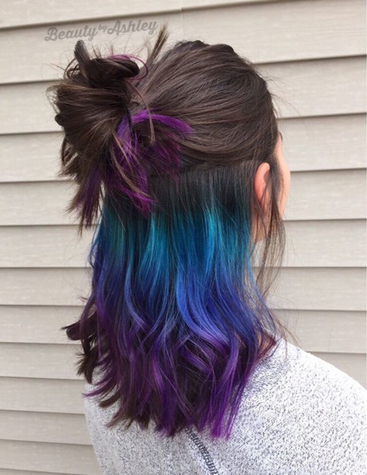 Não é necessário limitar-se a uma cor na coloração oculta. Você pode criar um bom gradiente de uma cor para outra. Ou apenas combine fios de diferentes tons. Por exemplo, azul e azul claro. A propósito, preste atenção a esta opção de estilo quando quiser mostrar a cor oculta. Um meio grupo é perfeito para isso.