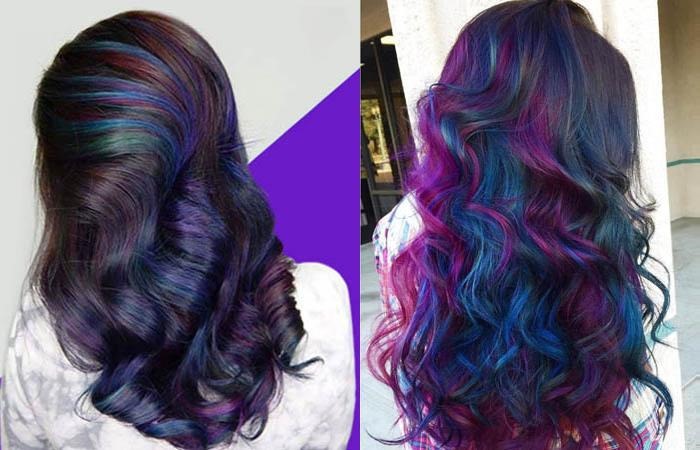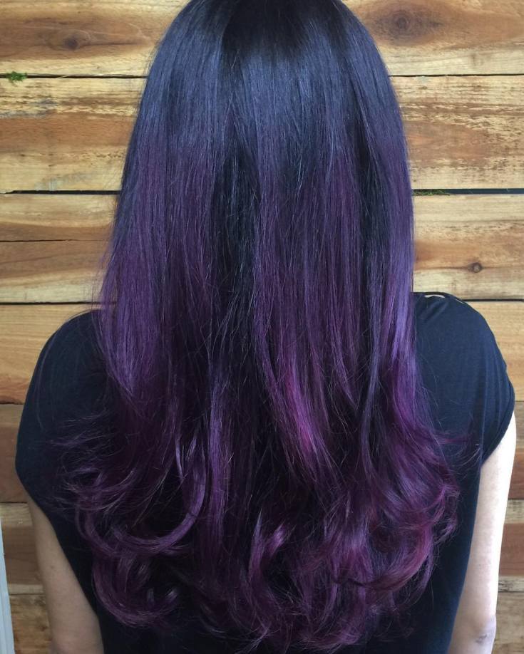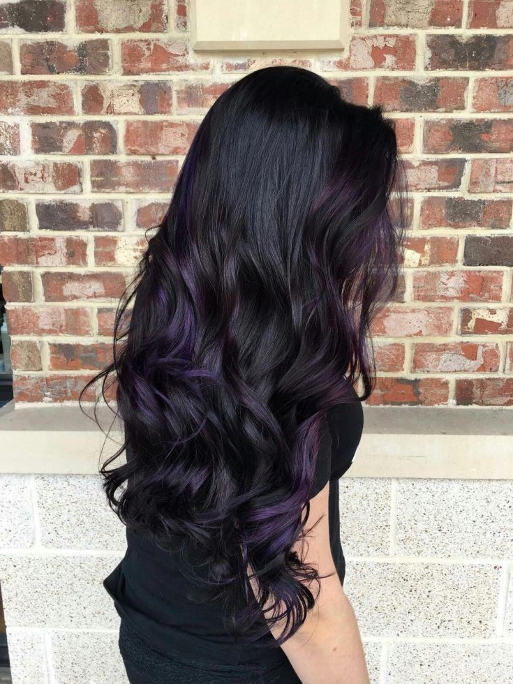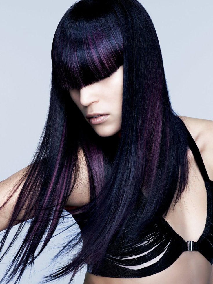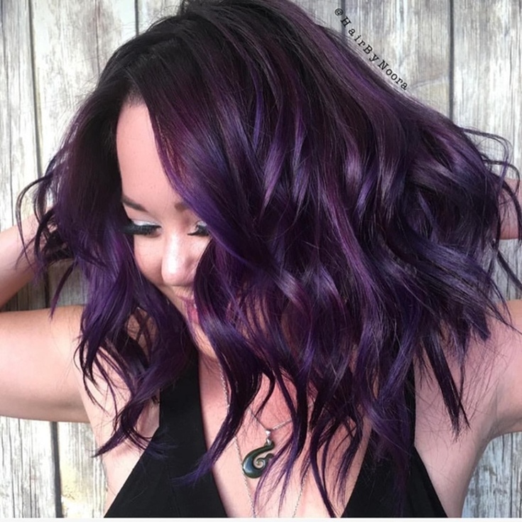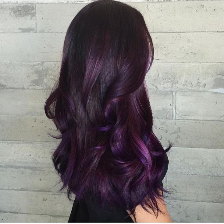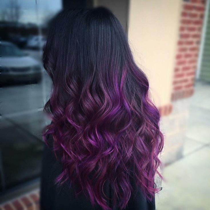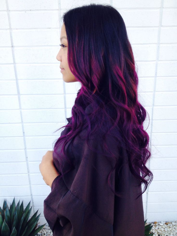 A paleta roxa funciona muito bem para essa técnica. Fica bem com cabelos escuros e loiros. Popular nesta estação é a transição do preto ou loiro acinzentado para um tom roxo ou de um cabelo castanho escuro para uma cor de ameixa rica.