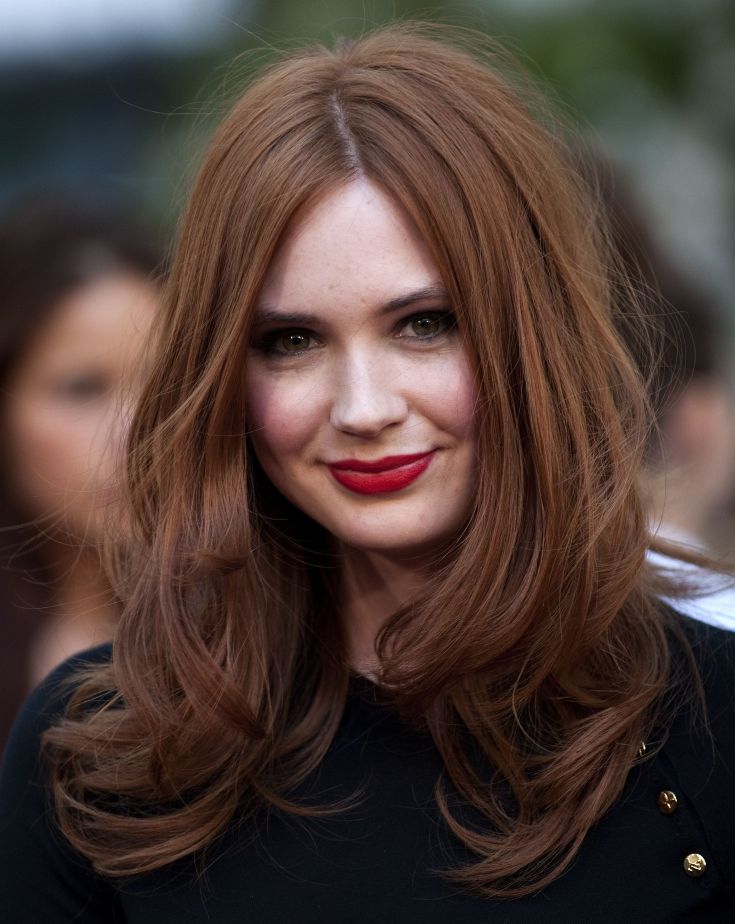 As mulheres com look outonal podem tingir com segurança os fios de um vermelho castanho. Vai parecer muito natural neles. Além disso, este tom fica bem em uma aparência de inverno com pele muito pálida. A cor do cabelo castanho-avermelhado neste caso torna a imagem mais expressiva e lúdica.