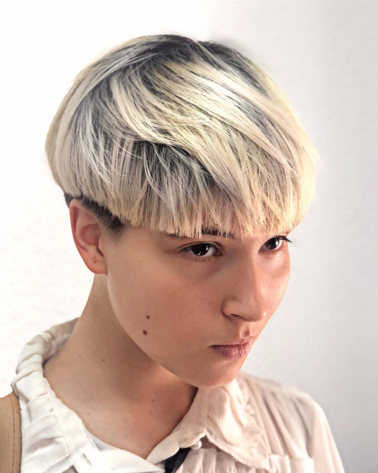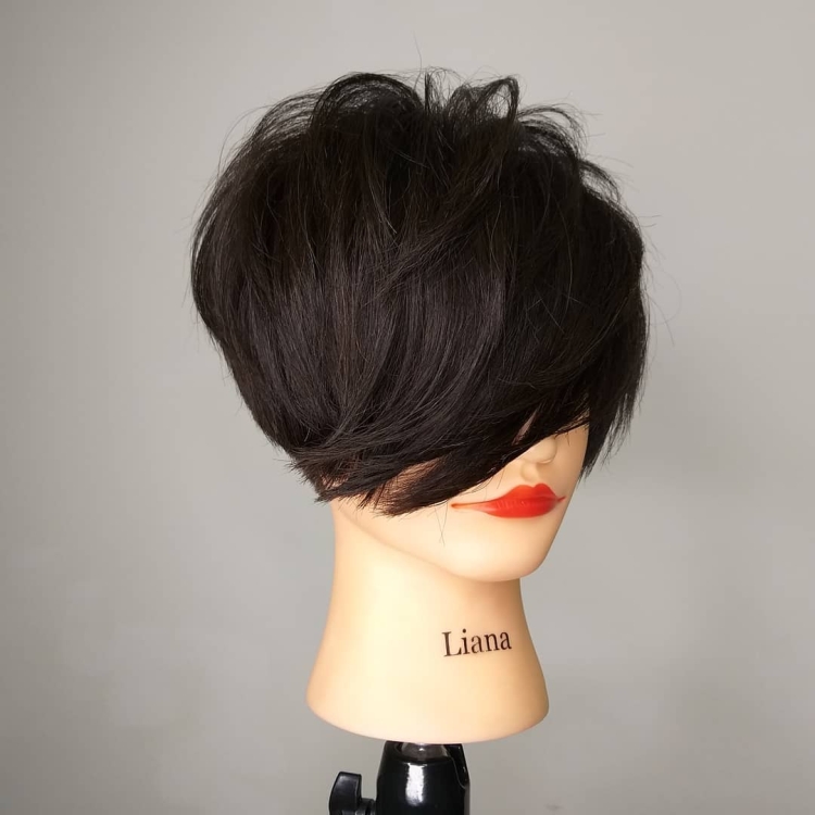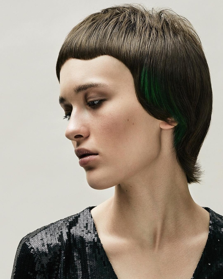 Cortes de cabelo curtos na nuca e franja longa que caem sobre o rosto ficam muito elegantes se o cabelo estiver perfeitamente esticado e a franja for colocada para a frente ou ligeiramente para o lado.