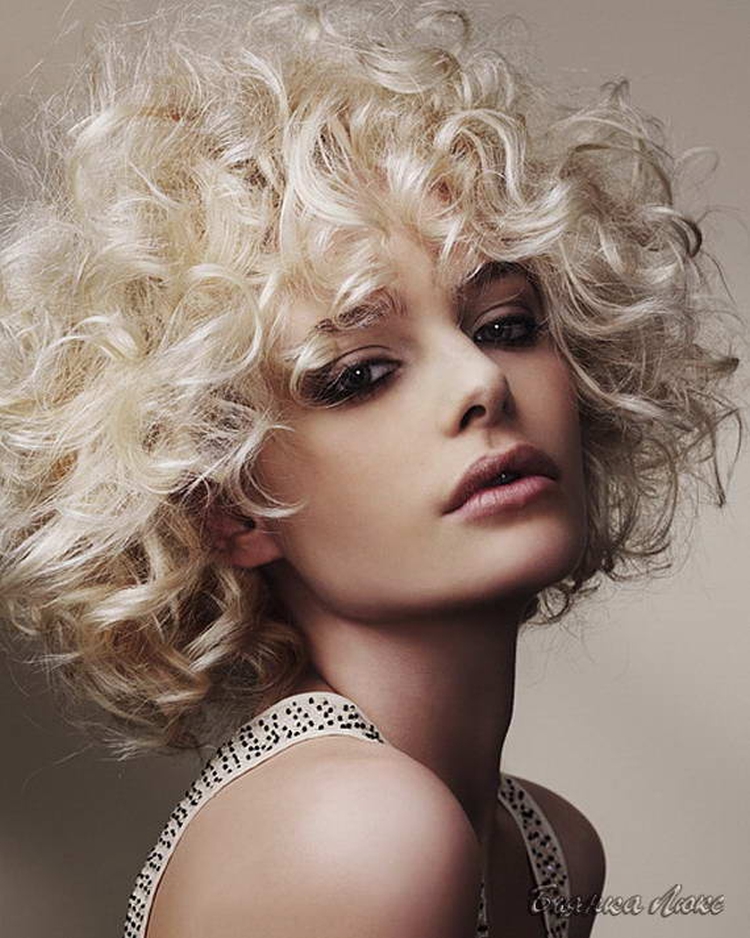 Penteados curtos e cacheados assimétricos com franja maciça em cachos grandes ou ondas, bem como várias opções de cortes graduais em cascata, ainda estão em voga.