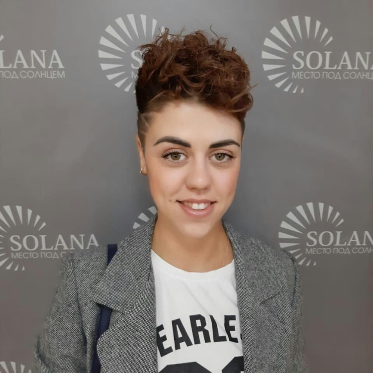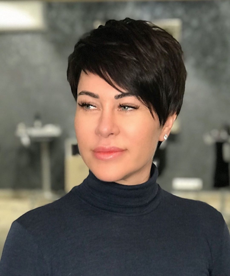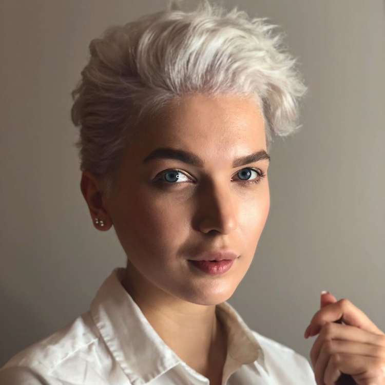 Evelina Khromchenko. Um jornalista, apresentador de TV e especialista em moda “popular” usou cortes de cabelo excepcionalmente curtos durante toda a sua vida adulta e só muda o tom de uma loira em sua imagem. Evelina complementa um laço tão estiloso com grandes óculos pretos, que se tornaram a principal atração de uma mulher.