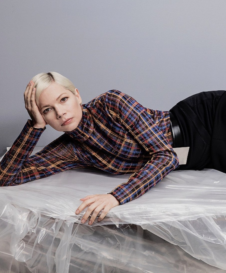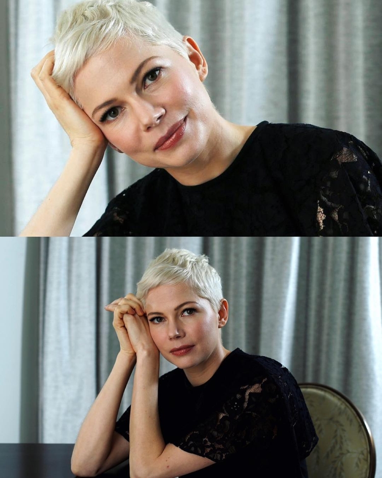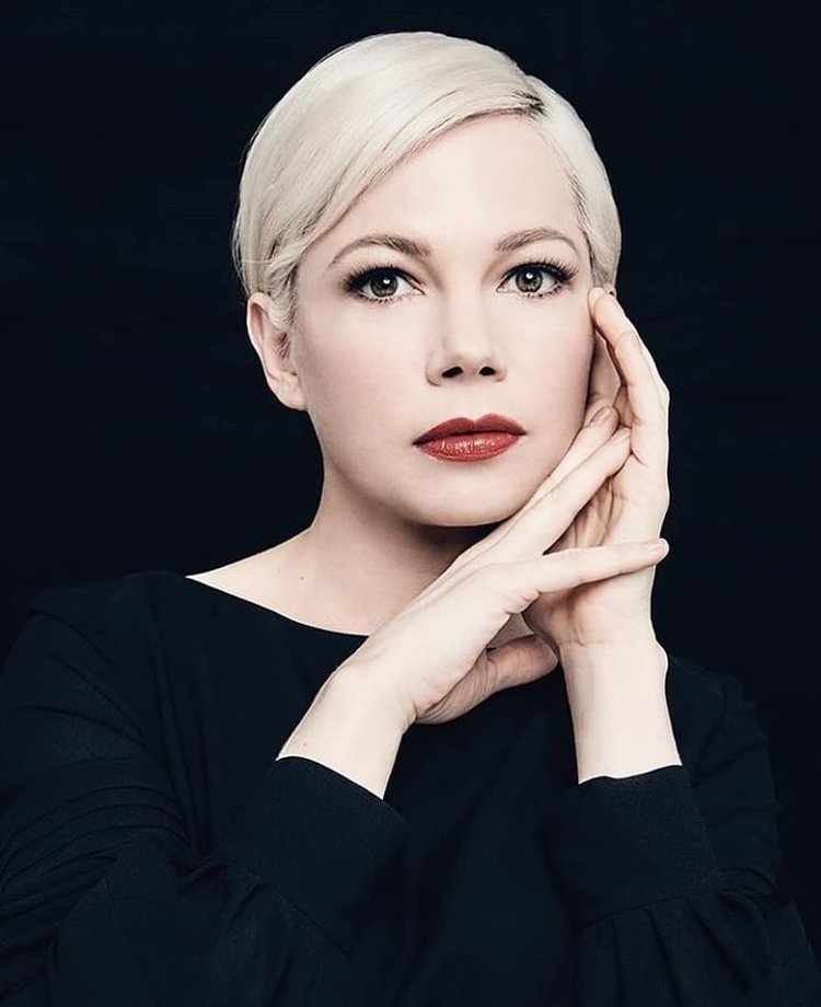 Michelle Williams. Por mais de uma temporada consecutiva, essa atriz vem exibindo o corte de cabelo pixie, agora ultramoderno, pintado em loiro cinza. Michelle faz experiências apenas com estilos e roupas, mudando assim sua imagem de elegante todos os dias para uma noite espetacular.