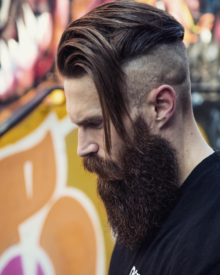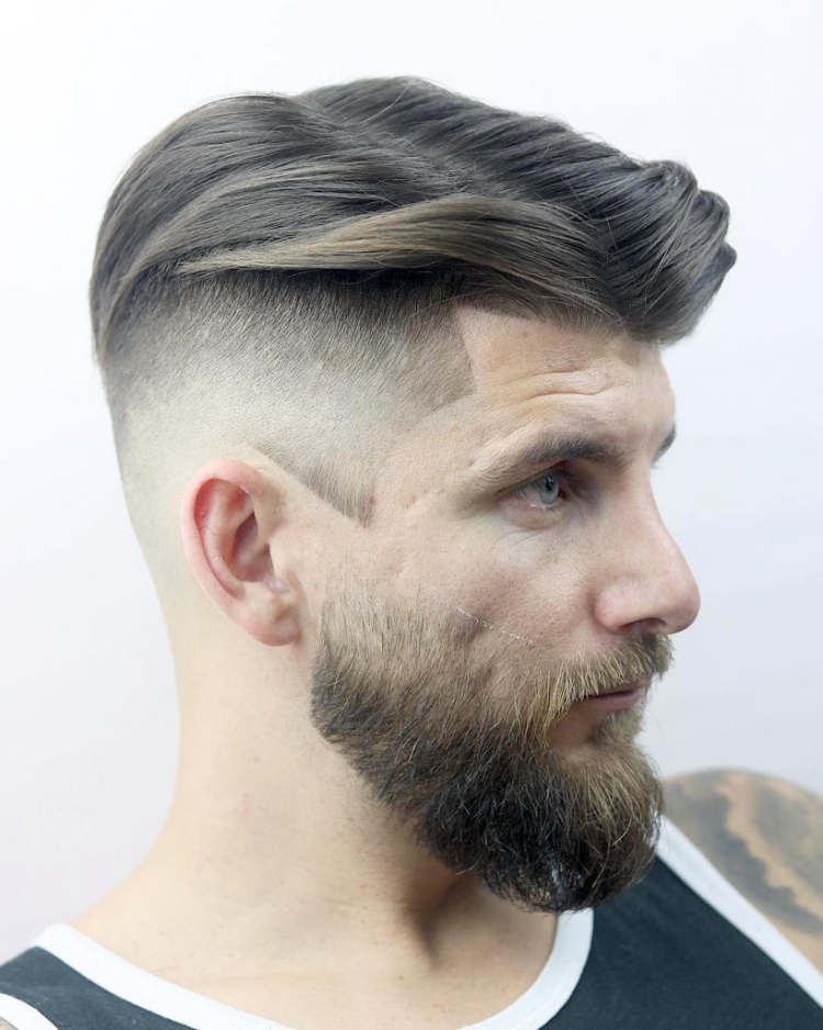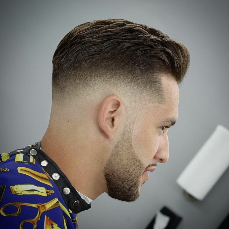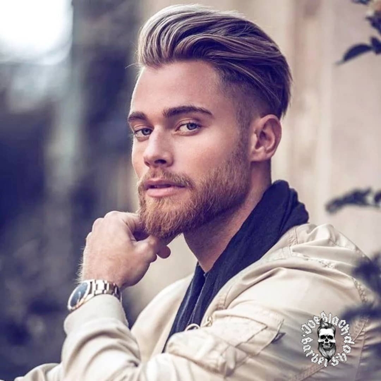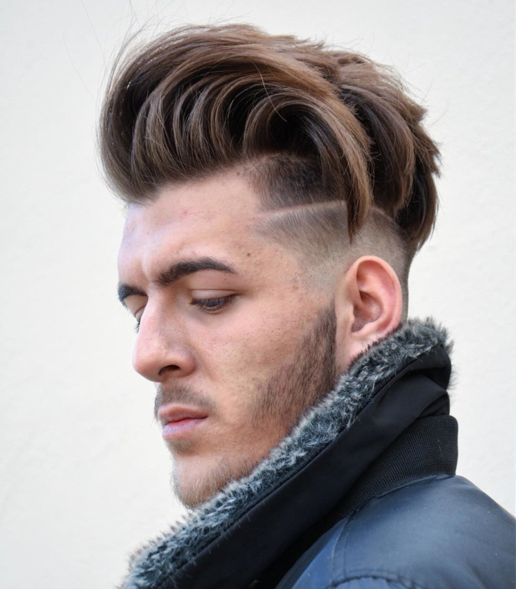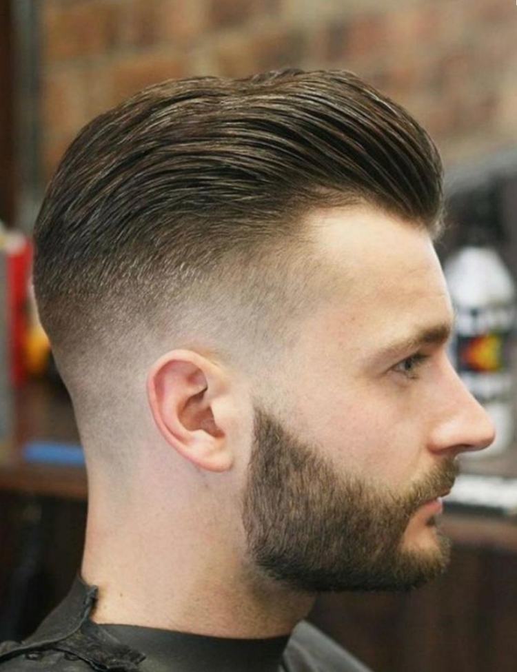 Este corte de cabelo masculino com laterais raspadas é popular entre representantes da metade forte da humanidade de qualquer idade.Sua característica distintiva é uma transição suave de uma longa mecha de cabelo para as têmporas raspadas.