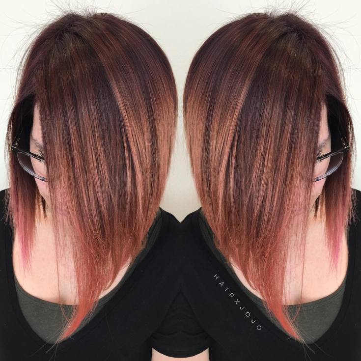 Uma versão semelhante do ombre é incorporada no quadrado de tal forma que a zona superior do cabelo é mais escura do que a inferior em pelo menos três tons. A mais clara delas ficará nas pontas dos fios, mas para criar uma transição suave também é necessária uma terceira tonalidade, aplicada pelo cabeleireiro na borda das duas principais.