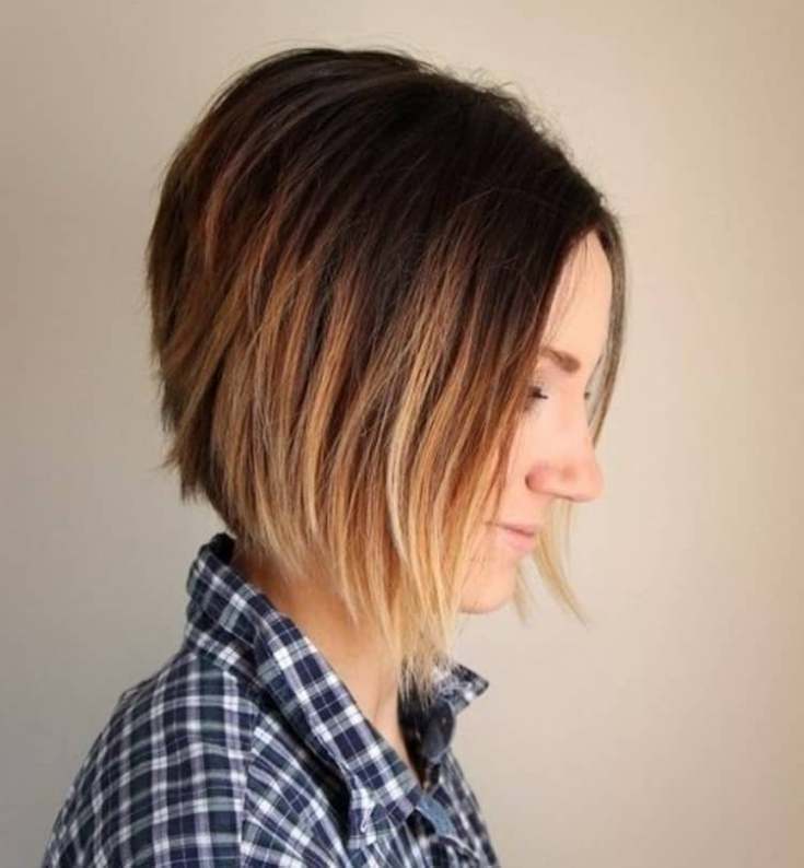 Ombre para cabelos curtos já é um clássico moderno. O bob de dois tons foi usado por Jessica Alba, Miley Cyrus, Jennifer Lawrence, Lucy Hale e muitos outros. A coloração complexa enfatiza perfeitamente o rosto aberto e torna o penteado mais brilhante e expressivo.