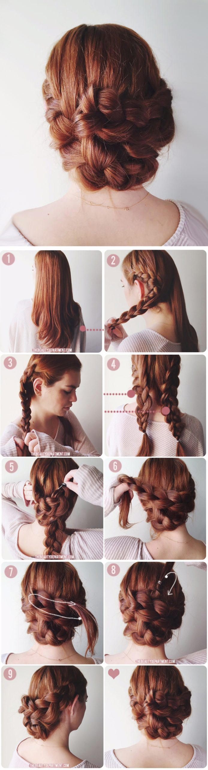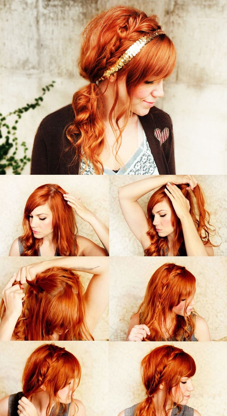 Para um look casual, solte alguns fios de cabelo em volta do rosto. No cabelo ruivo, espiguetas e tranças em dois estágios ficam bem: tranças finas entrelaçadas em uma grossa.