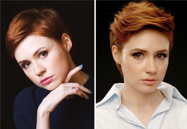 Devido ao fato de que a cor brilhante enfatiza a cor do rosto, existem muitos estilos de cabelo curtos nesta faixa: desde o curto para o menino até as opções de vários níveis. Claro, cabelos curtos grossos parecem atraentes, mas a intensidade da cor vai iluminar a falta de volume. Um penteado curto para cabelos finos tingidos de vermelho é muito preferível a cabelos loiros claros ou ruivos longos.