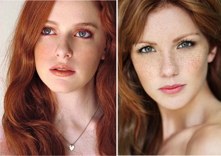 Meninas ruivas têm aparência de médio a alto contraste. Ao tingir o cabelo de vermelho e com baixo contraste, você terá que mantê-lo médio. Por ter um aspecto brilhante, às vezes basta adicionar um pouco de cor ou realçar um pouco os tons nativos do rosto, criando uma maquiagem natural.
