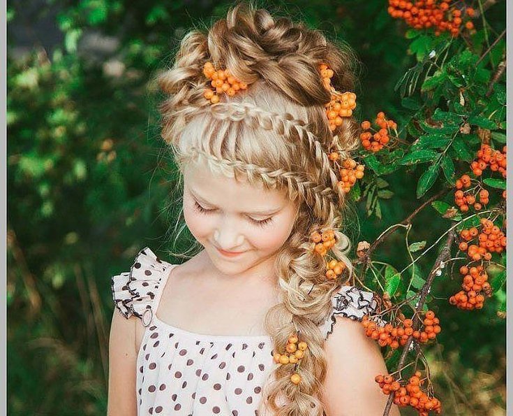 Podem ser cachos volumosos com tranças francesas ou holandesas, combinadas com uma teia de aranha, tecida a partir de elásticos, tranças retorcidas. Os penteados para meninas com um coque e a tecelagem com muitos fios parecem muito bonitos e até festivos.
