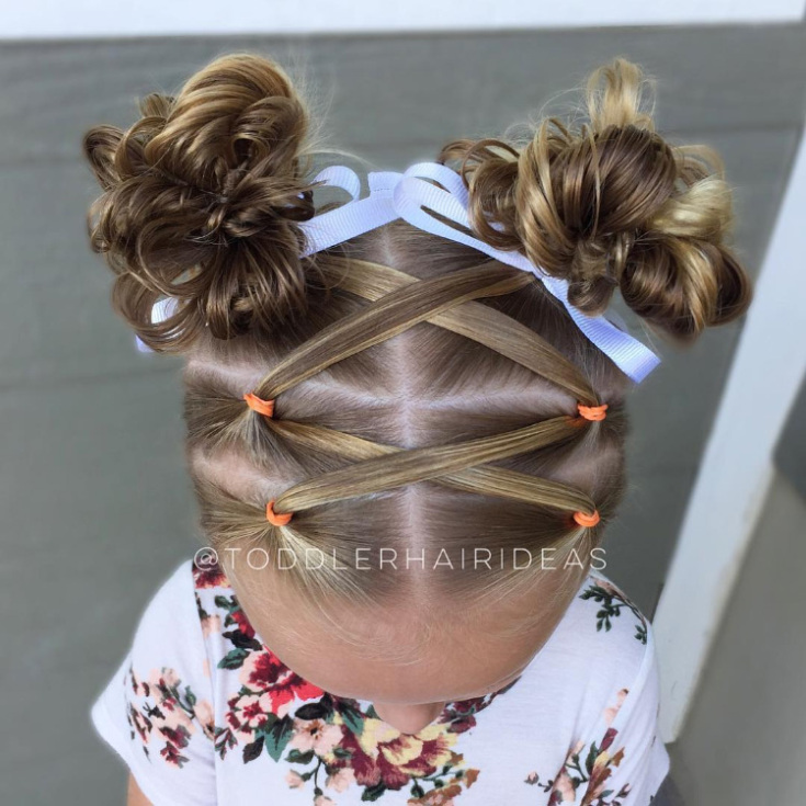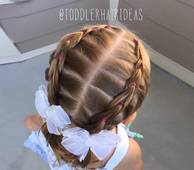 Com rabos de cavalo finos, você pode criar um padrão original que se assemelha a uma teia de aranha. Para fazer isso, você pode dividir o cabelo em partes iguais e trançar os penteados para o jardim de infância como na foto.