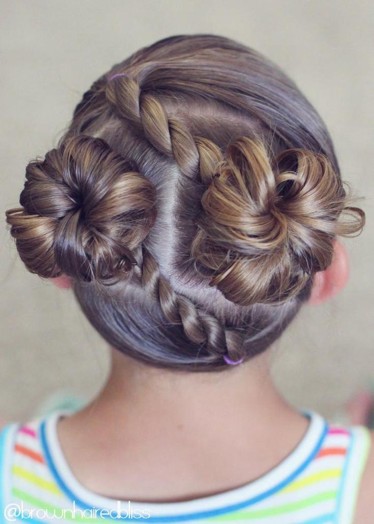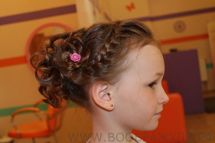 Se o bebê tem cabelo comprido, esse é um ótimo motivo para fazer experiências. Experimente um coque com quatro tranças. A partir deles você precisa formar uma aparência de uma flor e prender com grampos de cabelo. Decore o penteado acabado com decorações florais. Você obterá uma versão suave que permitirá dar mais mimetismo à imagem.
