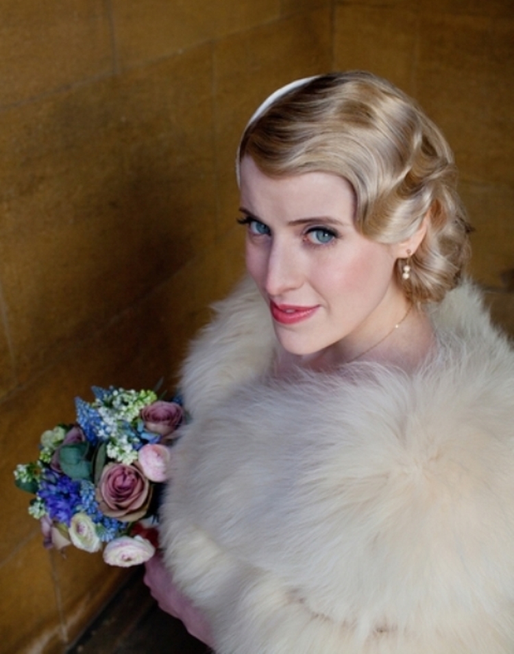 O estilo de acordo com os cânones dos anos 30 é ideal como penteado de casamento. Porém, é preciso lembrar que o look retrô deve estar em tudo. É necessário pensar com competência nos detalhes, por exemplo, substituir o véu por um véu, você também pode adicionar acessórios feitos de contas leves ou penas.