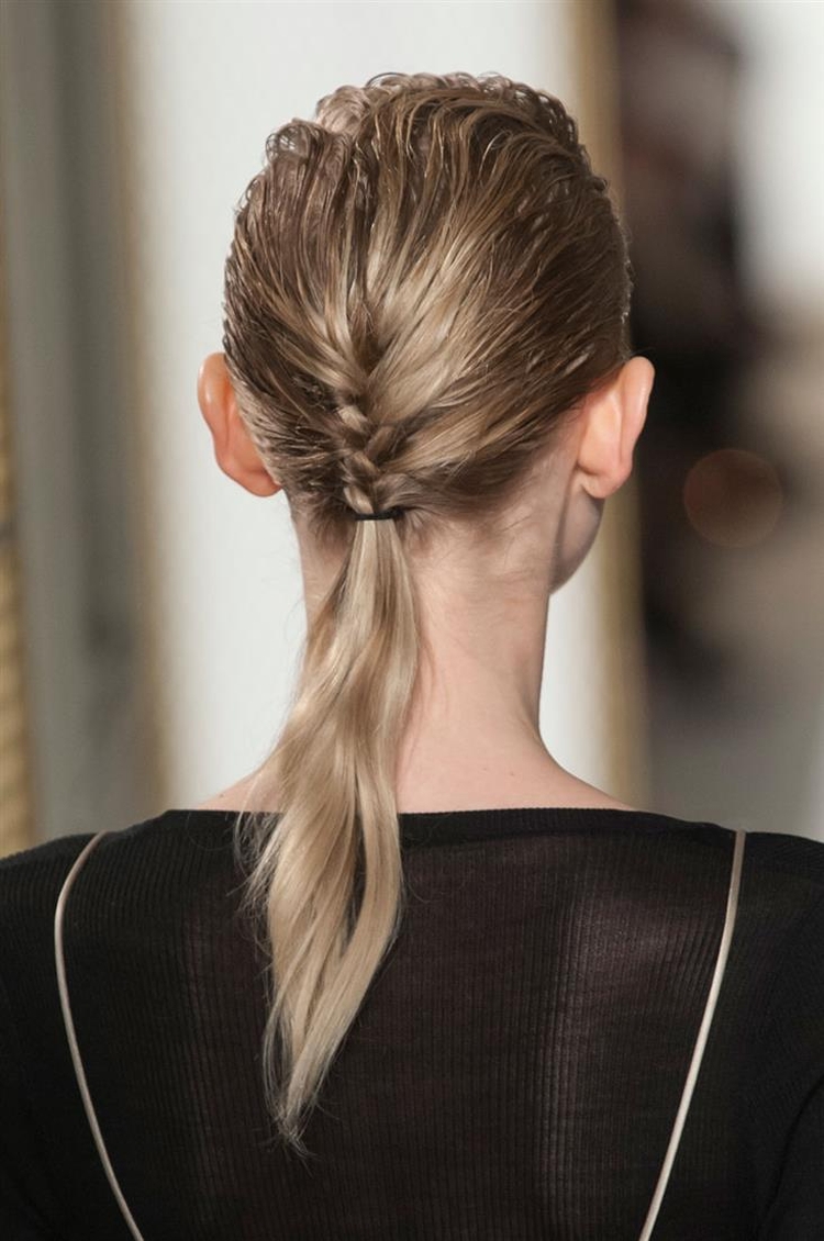 - Rabo de cavalo escovado. Vários fios na nuca e na coroa são penteados e trançados com um elástico na cauda.