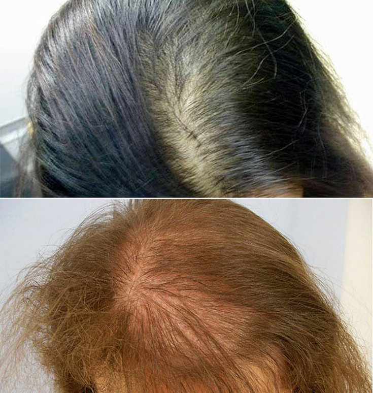 - Gradualmente, a divisão se expande, o couro cabeludo é claramente visível através do cabelo, o cabelo não volta a crescer.