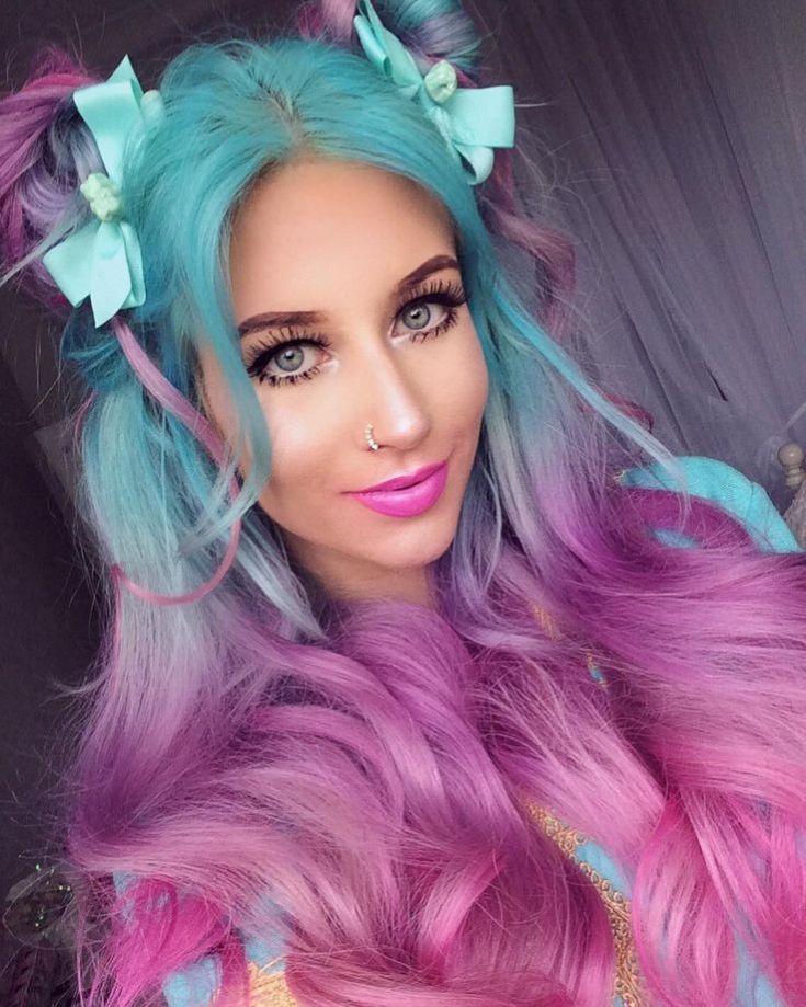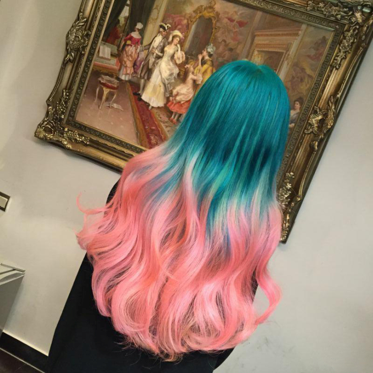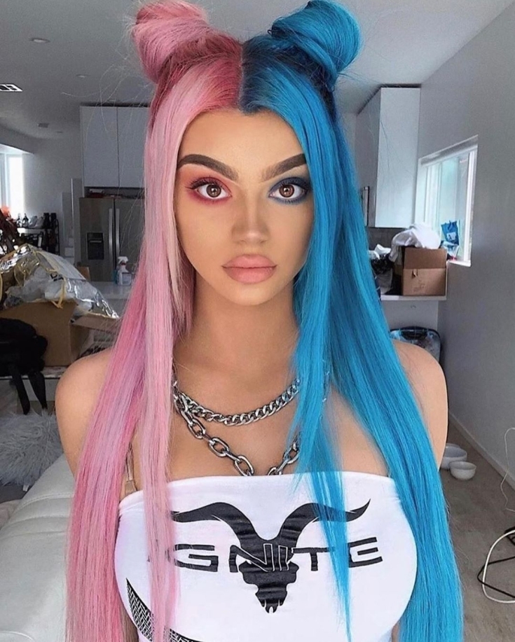A coloração do cabelo parece muito incomum e interessante, na qual metade dos fios é rosa de um lado e azul do outro. Este método é adequado para belezas extraordinárias que desejam chamar a atenção.