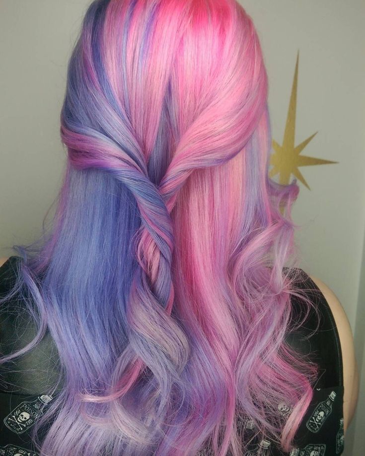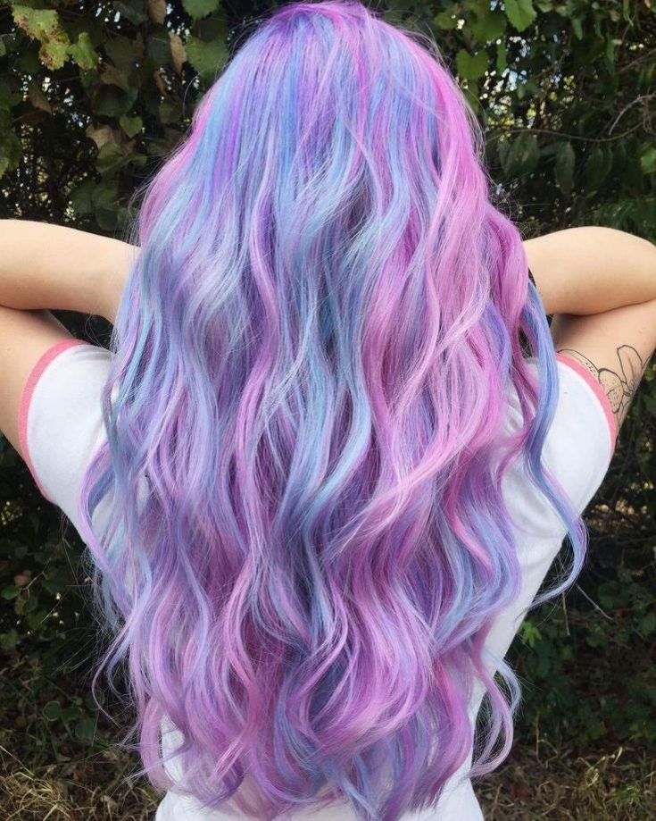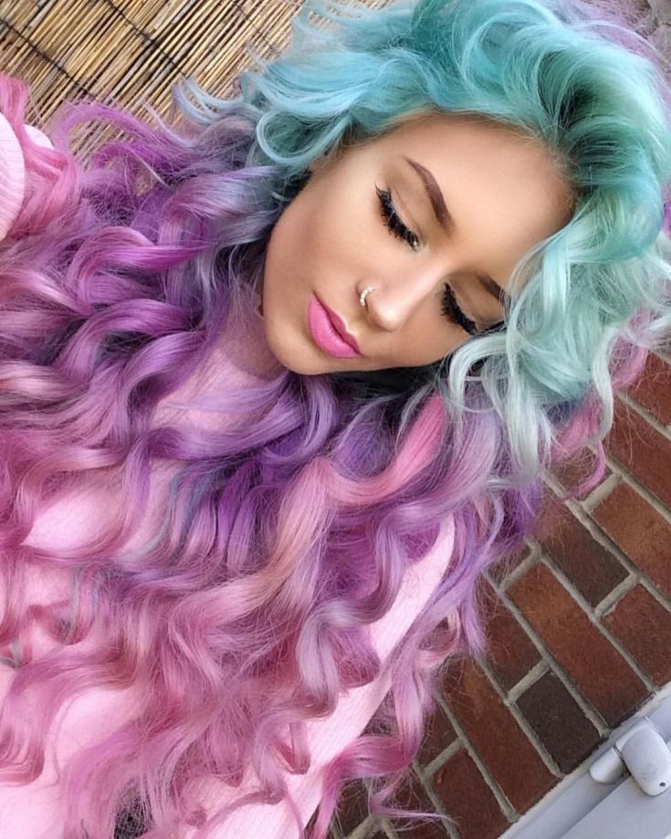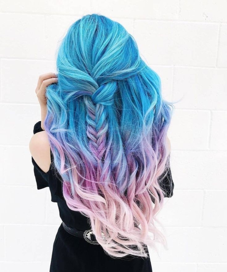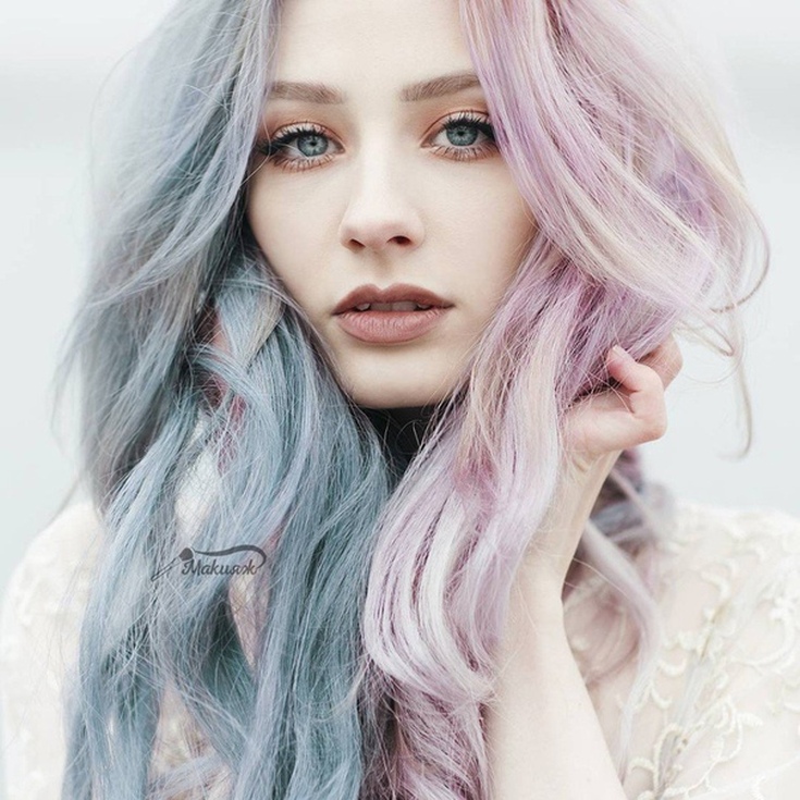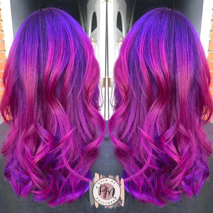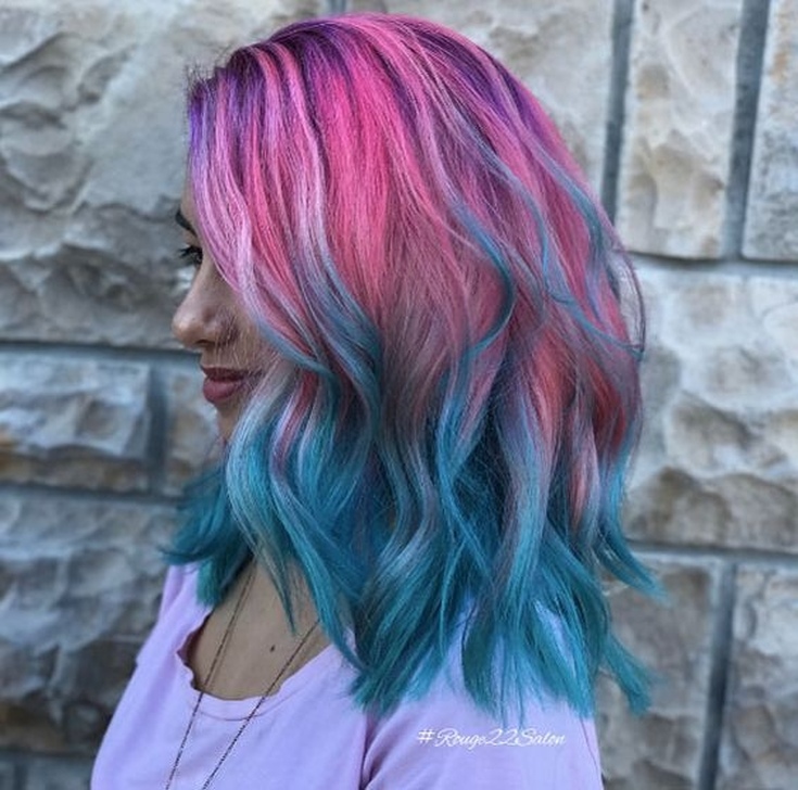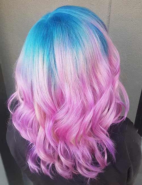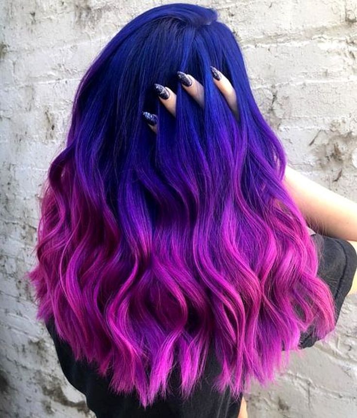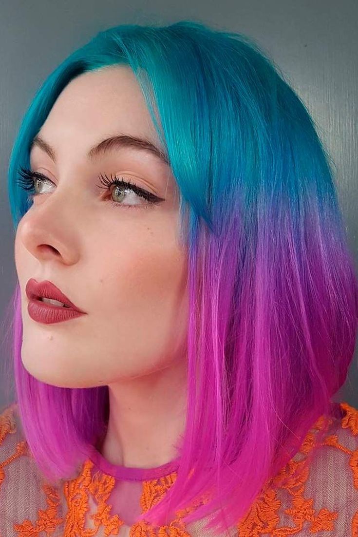 Os cabeleireiros satisfazem os desejos extravagantes das fashionistas pintando seus cabelos nas cores azul-vermelho e azul-rosa, porque combinam perfeitamente entre si. Para dar vida a esse método, a técnica ombre é mais adequada, quando duas cores do arco-íris fluem suavemente uma na outra. Fica linda em cachos longos.