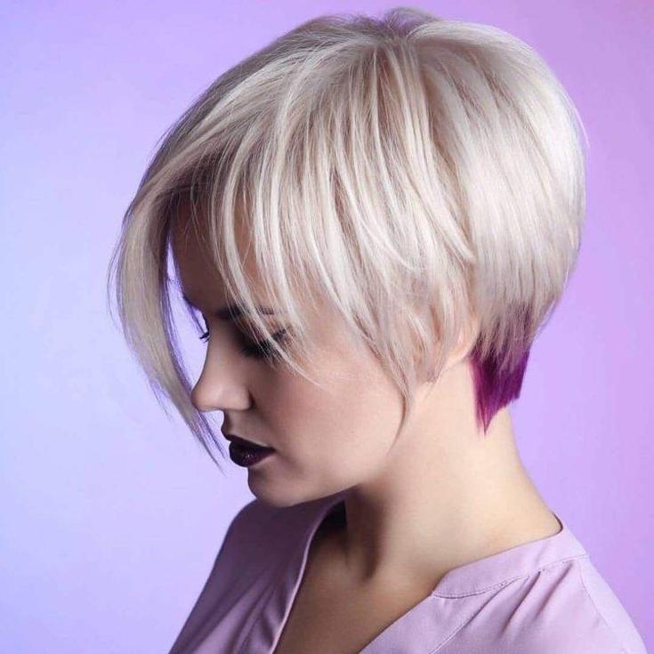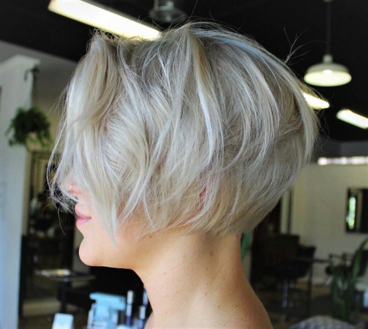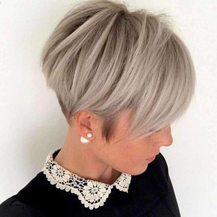 A tendência das últimas temporadas são os tons de cinza, diluídos nas raízes escuras e na nuca.Uma coloração tão elegante e moderna será a melhor solução para um bob curto com uma divisão lateral. A franja longa pode ser colocada de lado.