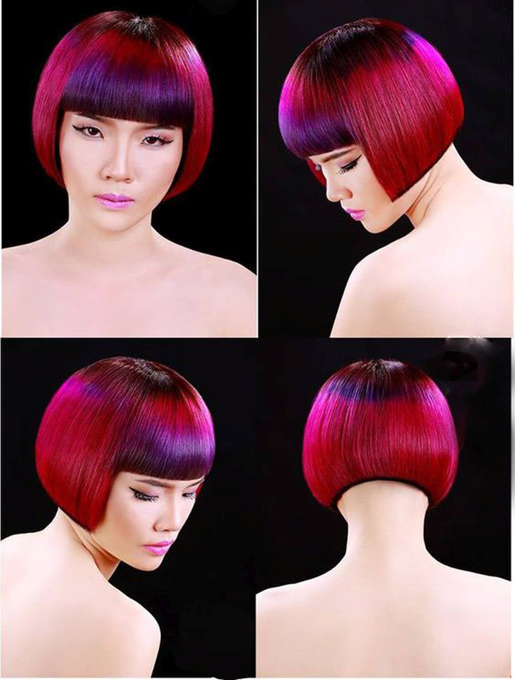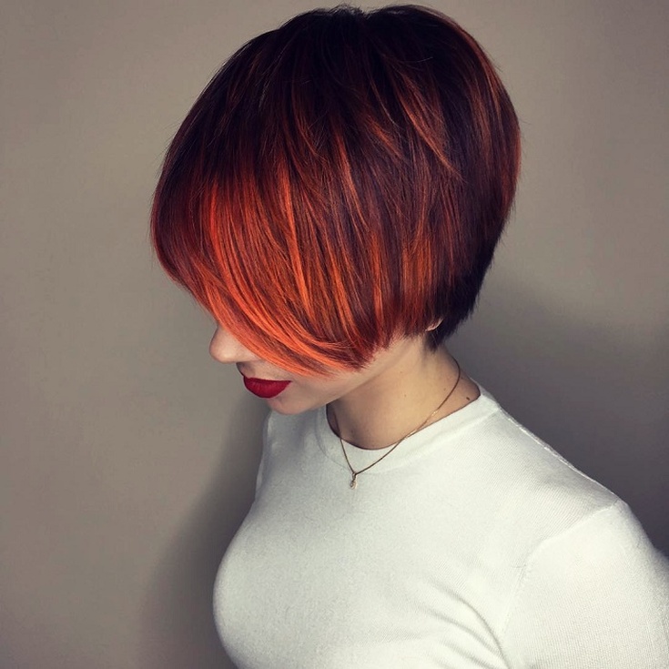 Um bob-square multi-layered, sustentado em paletas bordô-preto ou vermelho-preto, parece muito ousado e sexy em mulheres jovens. Além disso, pode ser um gradiente espetacular e um realce comum.
